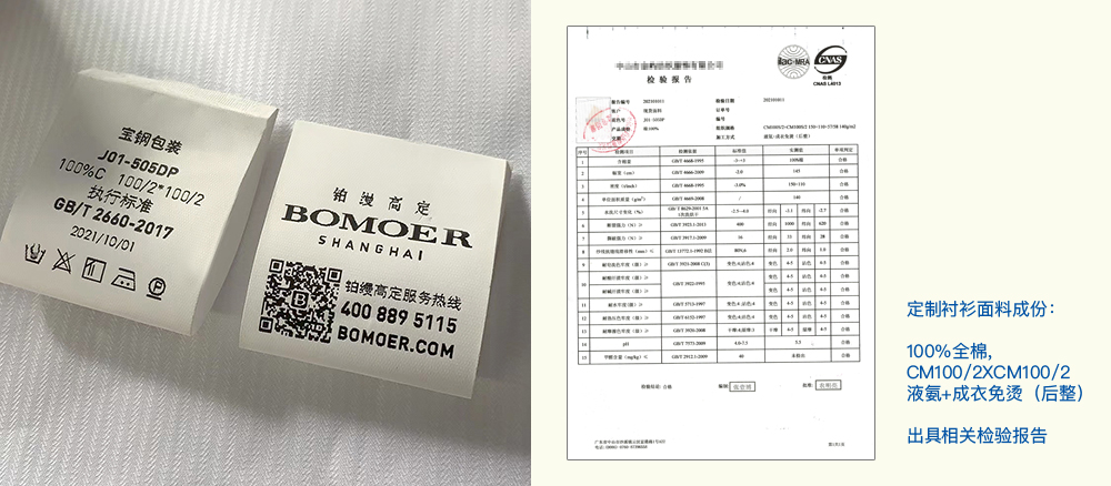 定制衬衫面料成份采用100%全棉,100支双股(CM100/2XCM100/2)液氨免烫面料,并在后整理加入成衣免烫处理工艺,成衣免烫衬衫一般采用先进的全方位立体塑形使棉纤维的分子之间产生交联记忆,从而达到优异免烫效果,并完整保留了全棉织物的挺括、柔软、舒适、吸湿、透气,等特点。